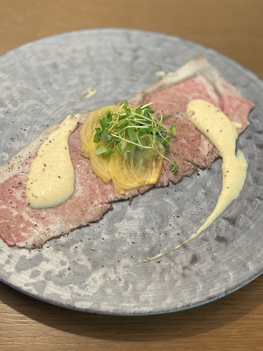 低温調理でとろけるサーロインにフレッシュな柿、バターソテーしたクレソンを乗せて、柿と生クリームの濃厚ソースをON。